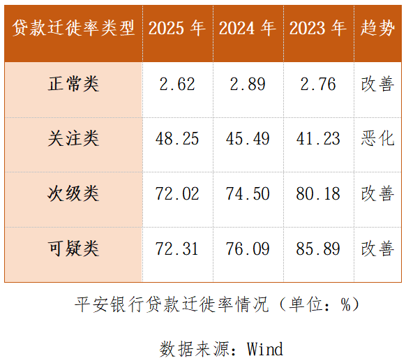 根据平安银行财报中的监管指标显示,其贷款分类迁徙率也呈现分化态势: