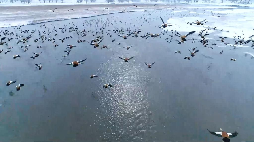 近日,一场大雪覆盖了内蒙古萨拉乌苏国家湿地公园,数日未见的候鸟再次聚集,大天鹅、赤麻鸭、绿头鸭各类候鸟总数达1万余只,与流淌的萨拉乌苏河交相辉映,冬日的萨拉乌苏湿地依旧充满生机。