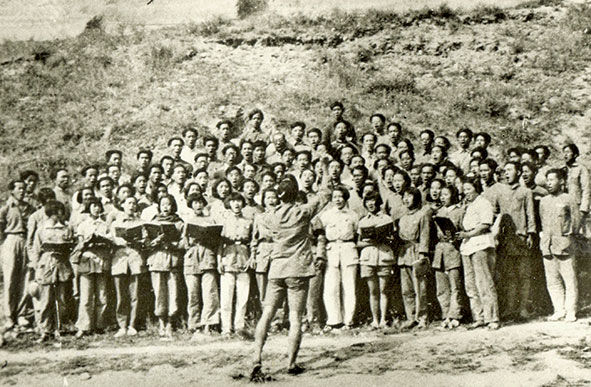 ▲1939年,冼星海指挥鲁艺学员排练《黄河大合唱》(资料照片)。延安文艺纪念馆提供