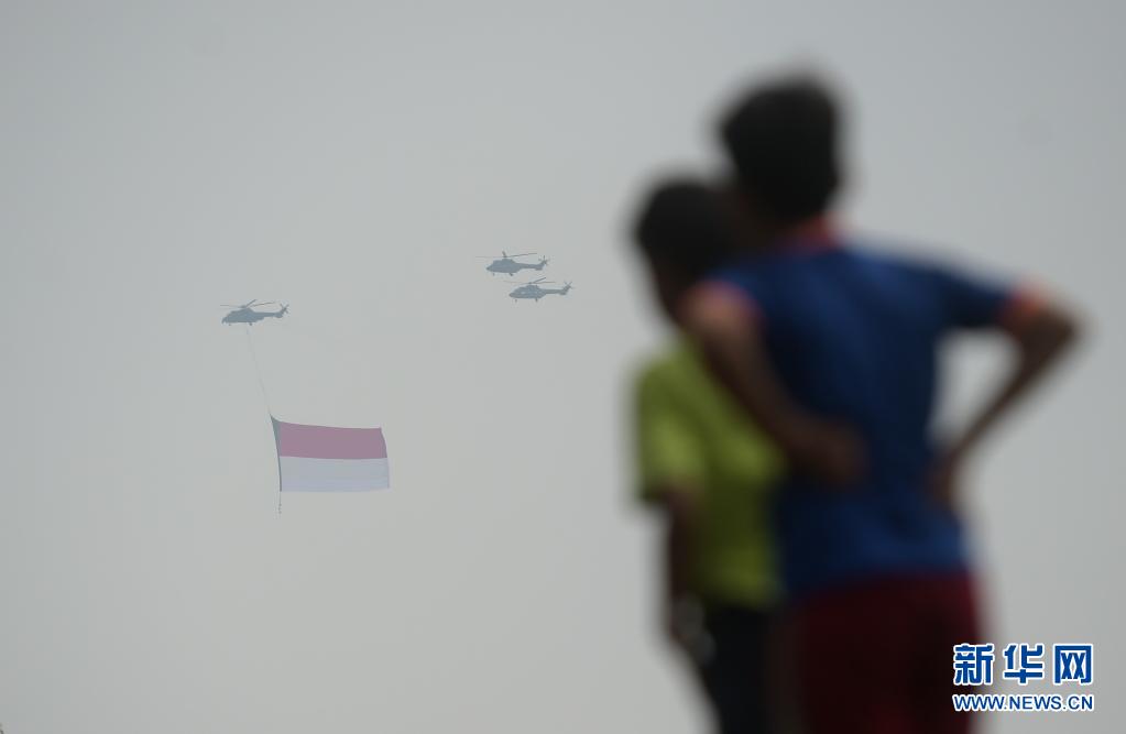 8月17日,人們注視著懸掛印度尼西亞國旗的直升機飛過雅加達上空。8月17日是印度尼西亞獨立日。新華社發(祖卡南攝)