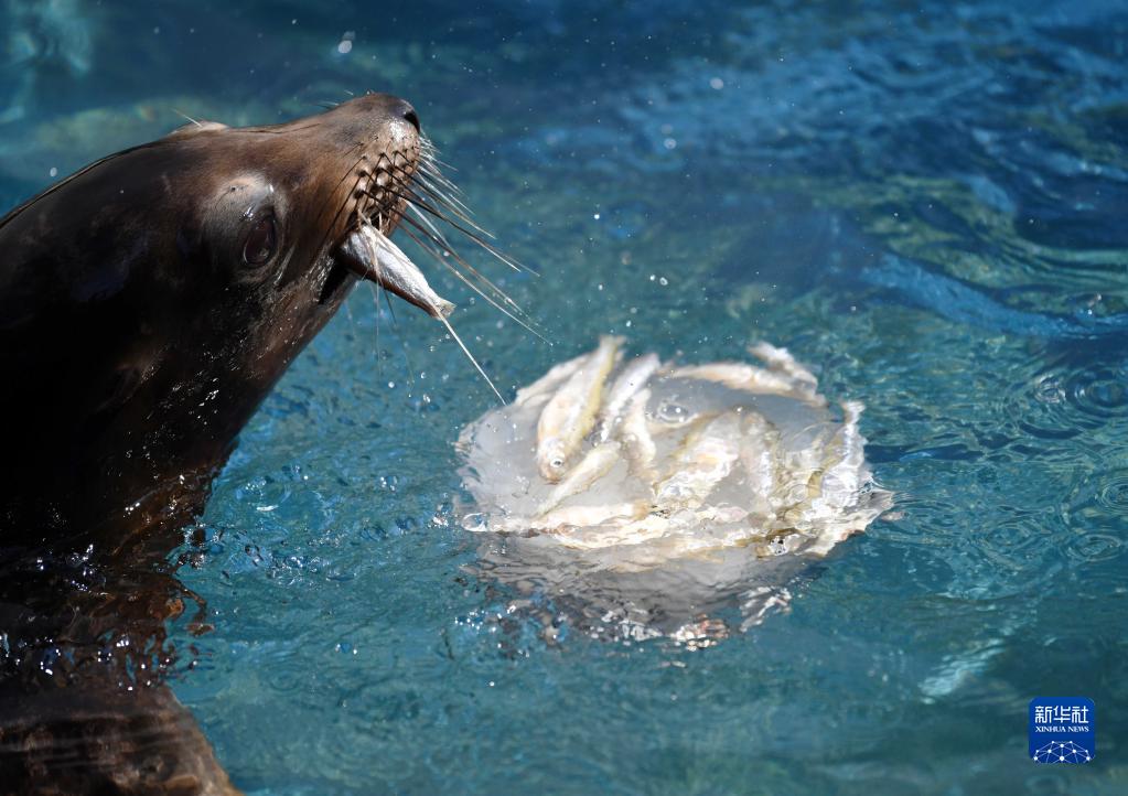 8月26日,一只海獅在意大利羅馬動物園享用冰凍食物。