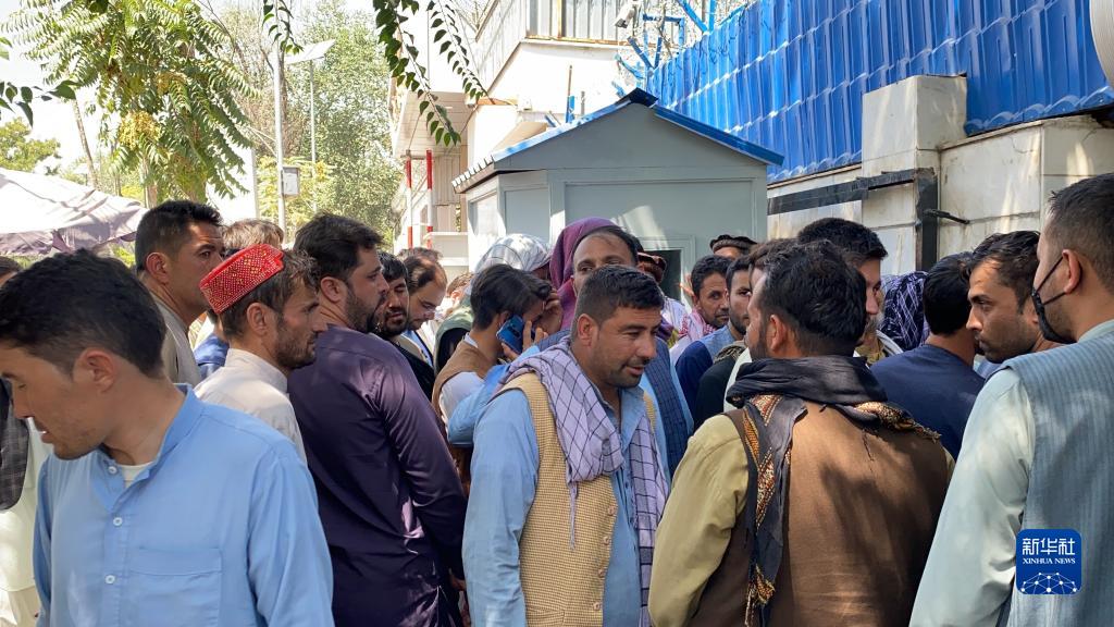8月26日,人們在阿富汗喀布爾一家銀行外排隊。