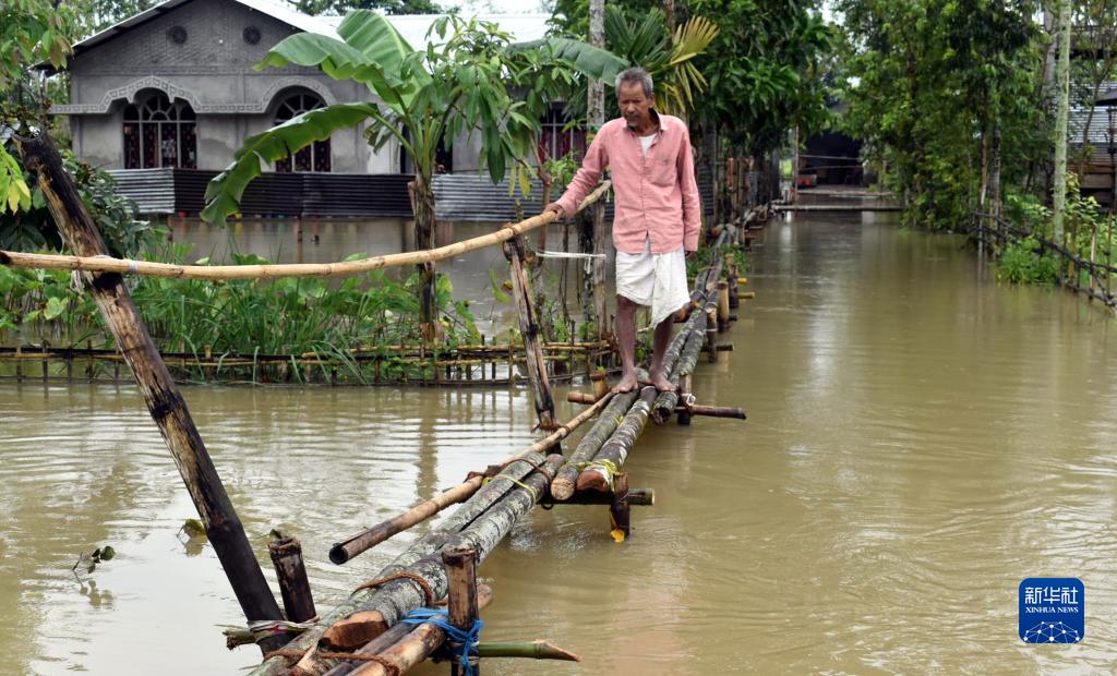 8月28日,一名男子在印度阿薩姆邦一個(gè)洪水泛濫的村莊走過簡(jiǎn)易木橋。