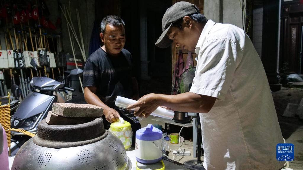 8月27日凌晨,胡國新(左)和他的世侄胡高明(右)在莆田市平海鎮上居村的家中打包飯菜。