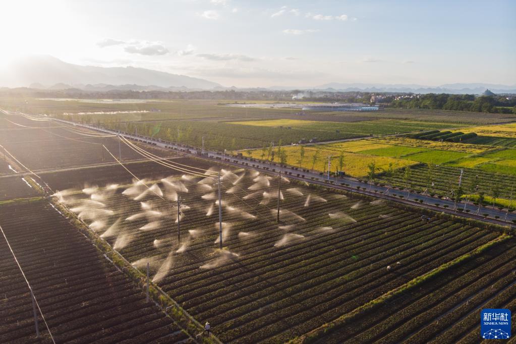 8月30日,在濂溪大洞蔬菜基地,灌溉系統在給蔬菜澆水(無人機照片)。