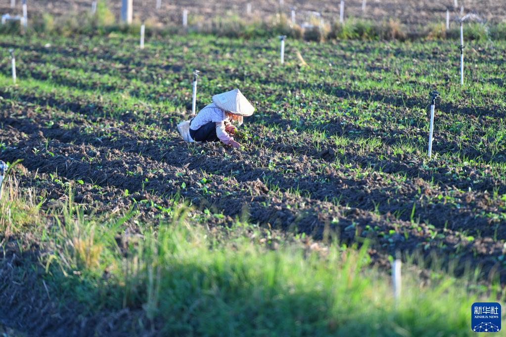 當日,天氣晴好,在湖南省永州市道縣清塘鎮濂溪大洞蔬菜基地,農戶搶抓農時在田間勞作。
