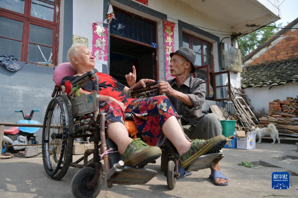 在江西省南昌縣三江鎮(zhèn)徐羅村,羅安民陪著老伴在院子里聊天(9月5日攝)。雖然老伴因為患病不能說話,但她能聽懂羅安民的每一句話。