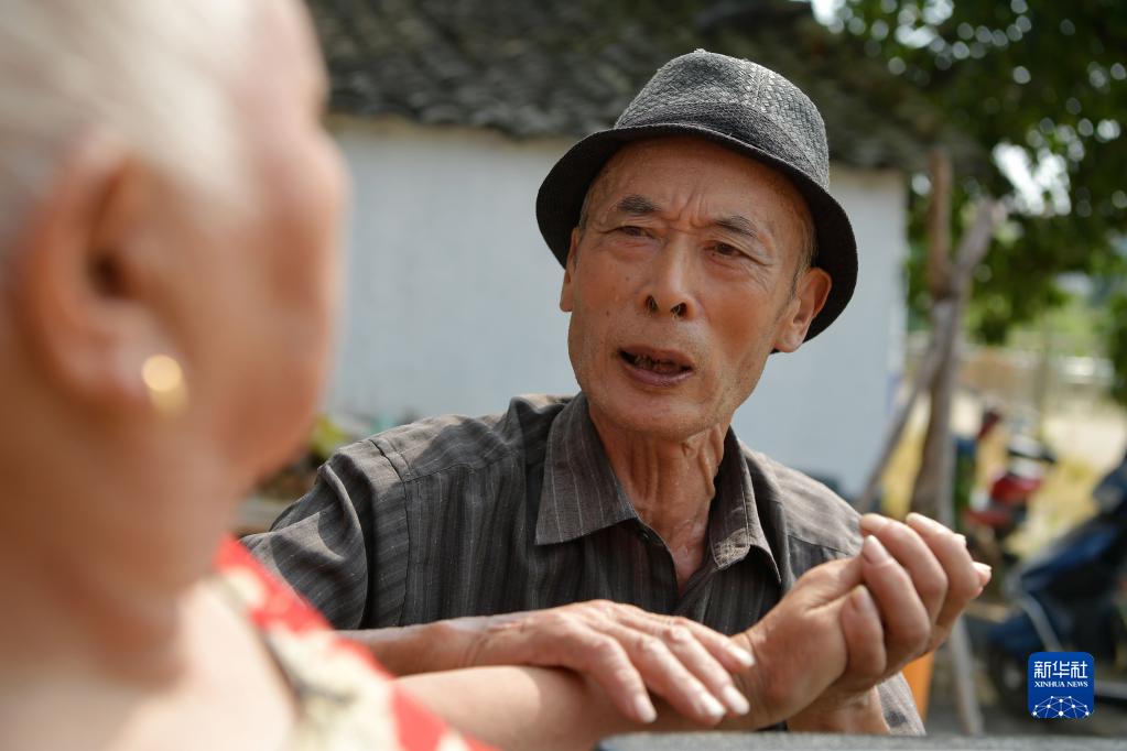 在江西省南昌縣三江鎮徐羅村,羅安民陪老伴在院子里聊天(9月5日攝)。