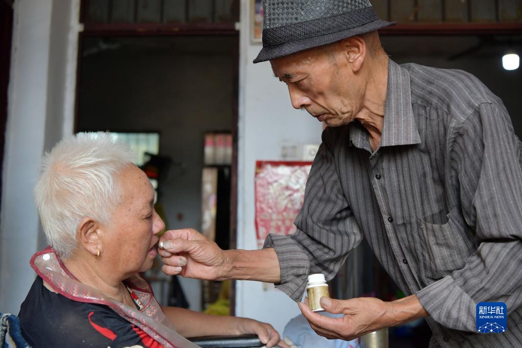 在江西省南昌縣三江鎮徐羅村,羅安民喂老伴吃藥(9月5日攝)。