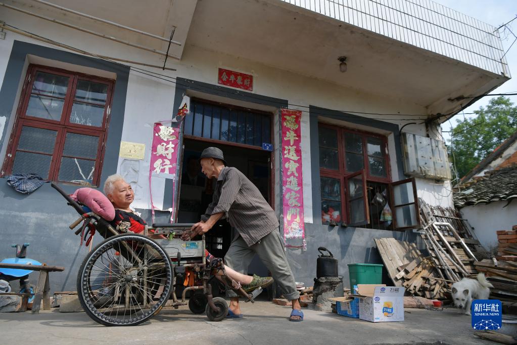 在江西省南昌縣三江鎮徐羅村,羅安民推著老伴外出曬太陽(9月5日攝)。