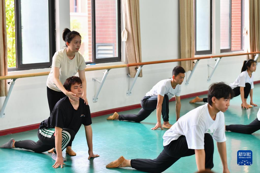 在長沙職業技術學院特殊教育學院的舞蹈房里,鄧蕓虹(左一)幫助學生矯正熱身姿勢(9月7日攝)。