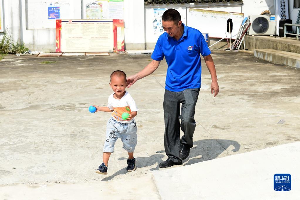 在菥荻教學點,許新民和學前班學生朱元浩做游戲(9月1日攝)。