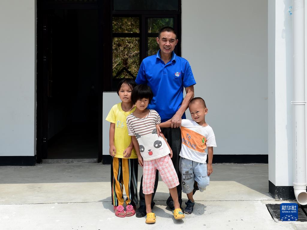 在菥荻教學點,許新民和三名學生在教室前合影(9月1日攝)。