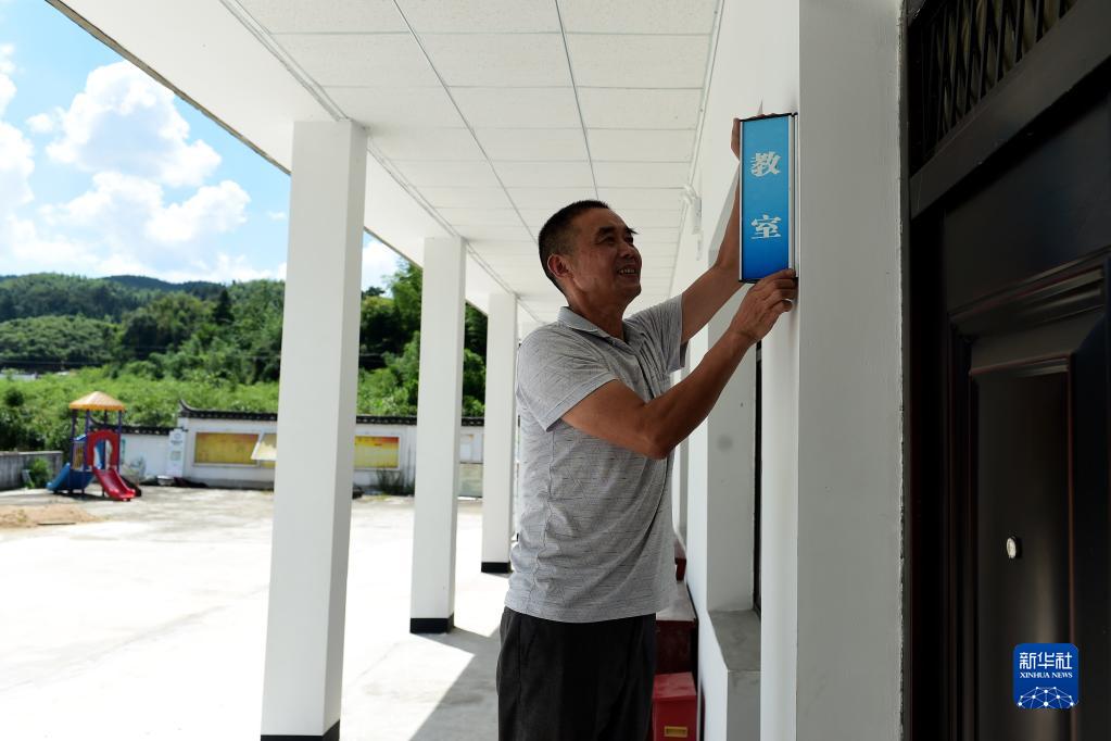 在菥荻教學點,許新民在懸掛教室標識牌(8月31日攝)。