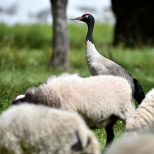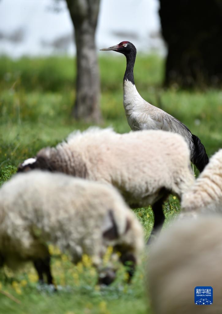 9月8日,黑頸鶴站在羊群中。