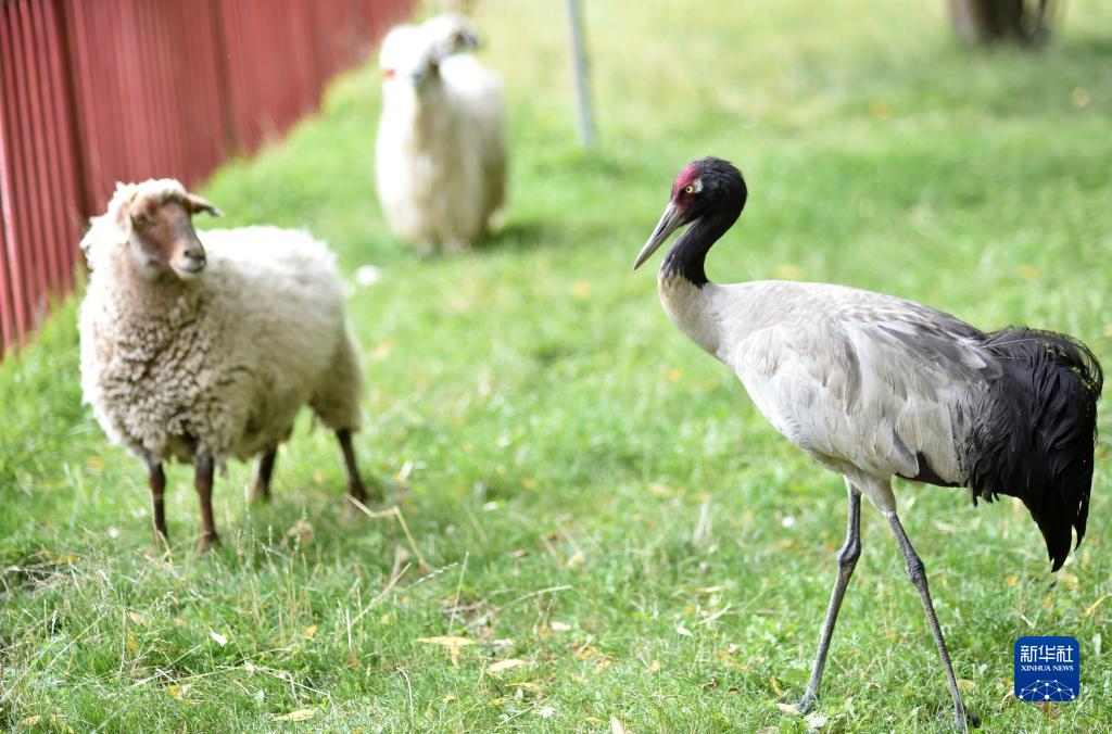 9月8日,黑頸鶴站在羊群中。
