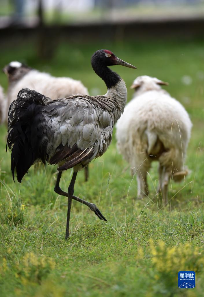 9月8日,黑頸鶴站在羊群中。