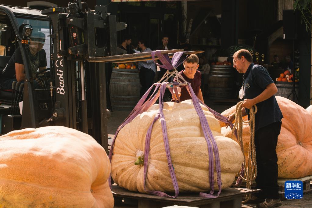 9月12日,在德國洛馬爾傳統南瓜節上,工作人員用鏟車給一個南瓜稱重。