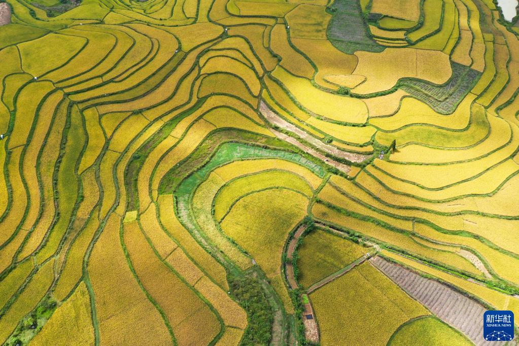 連日來,貴州省黔南布依族苗族自治州龍里縣灣灘河鎮天氣晴好。水稻成熟,田野鍍金,農民搶收稻谷,一片豐收景象。