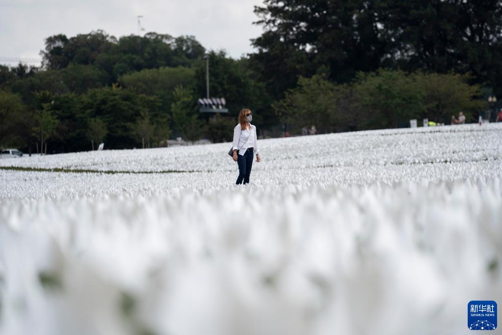 9月16日,在美國(guó)首都華盛頓,一名女子從草坪上的白色旗幟旁走過。
