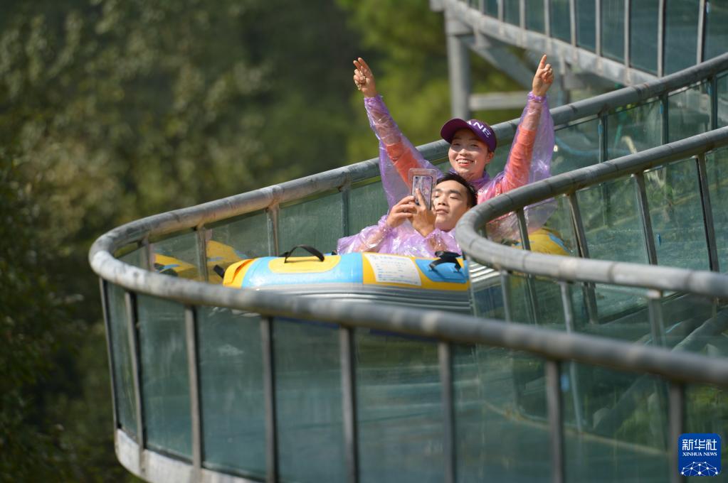 10月2日,在貴陽市開陽縣南江大峽谷,游客體驗玻璃滑道。