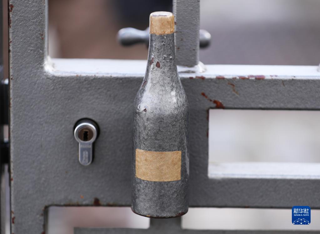 這是10月6日在法國(guó)巴黎蒙馬特高地葡萄園拍攝的酒瓶形狀的門(mén)把手。