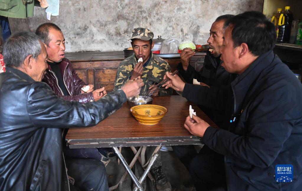 10月12日,在山西省汾西縣本家莊自然村,胡志榮(右一)和村民吃中午飯。新華社記者 柴婷 攝