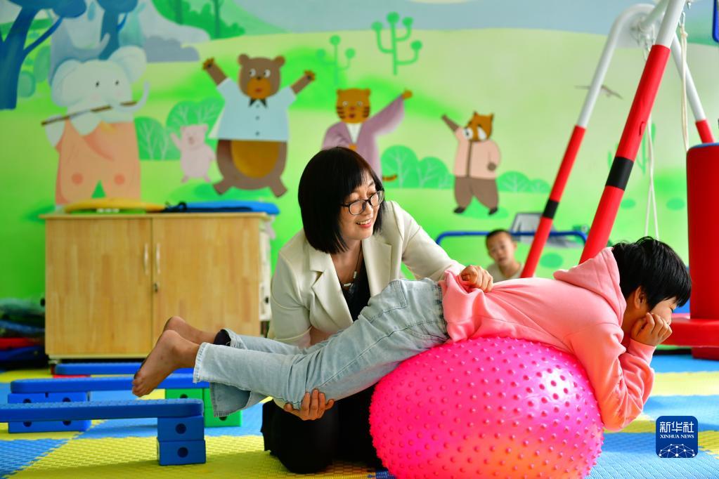 10月13日,張余敏(左)在海興縣特教學校內帶領一名學生進行感統訓練。