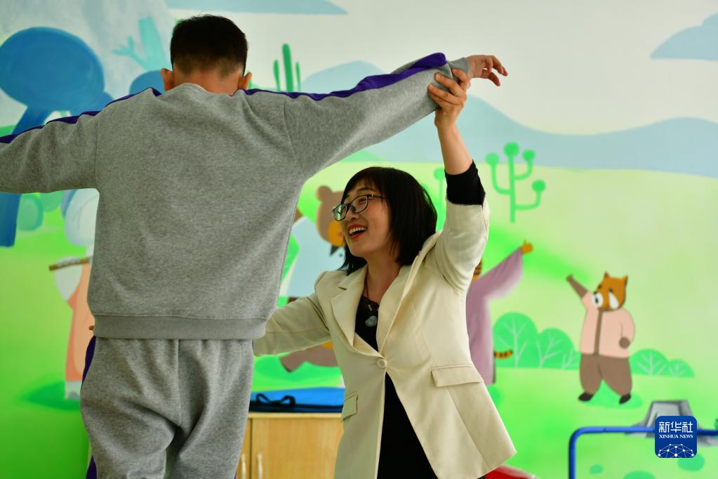 10月13日,張余敏(右)在海興縣特教學(xué)校內(nèi)帶領(lǐng)一名學(xué)生進行感統(tǒng)訓(xùn)練。