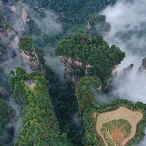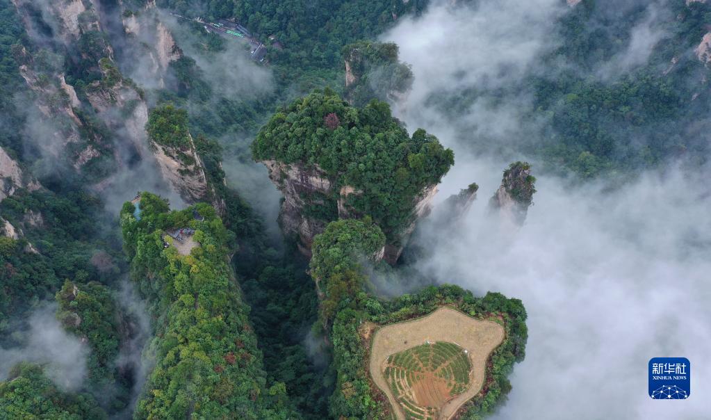 當日,雨后的湖南張家界武陵源,云霧飄蕩在峰林之間,若隱若現,美不勝收(無人機照片)。新華社發(吳勇兵 攝)