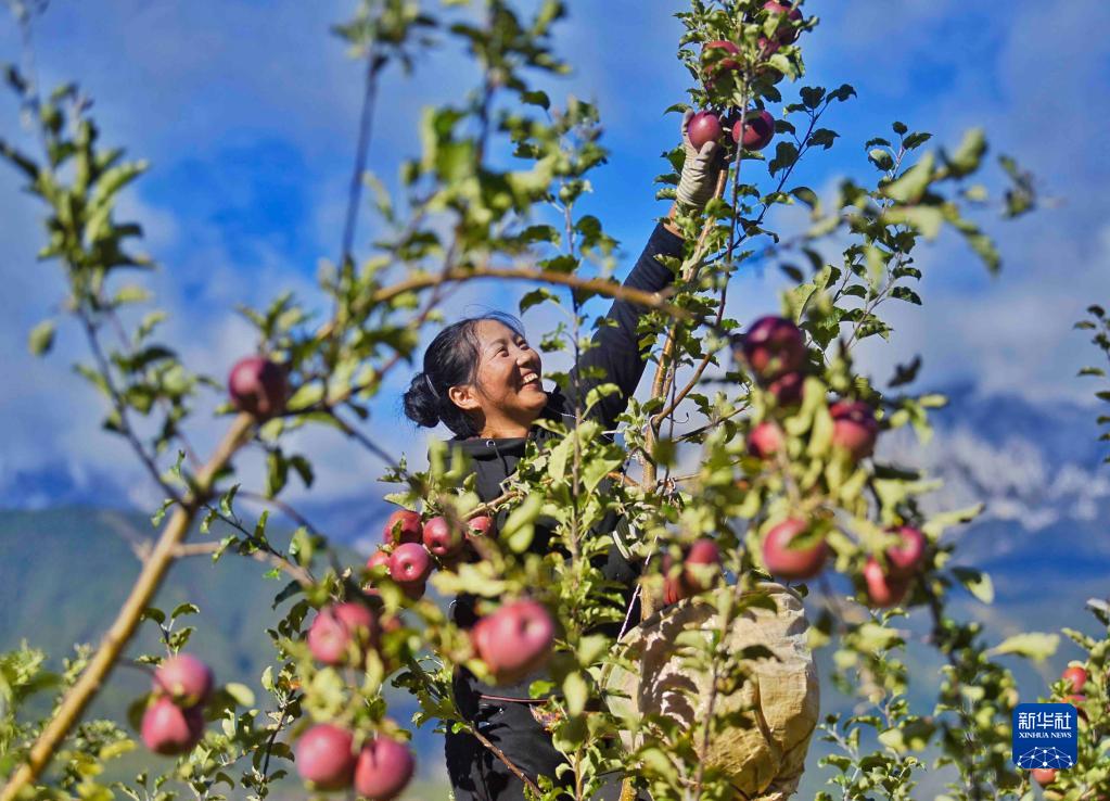 10月20日,村民在四川甘孜鄉(xiāng)城縣青德鎮(zhèn)萬畝果園里采摘蘋果。