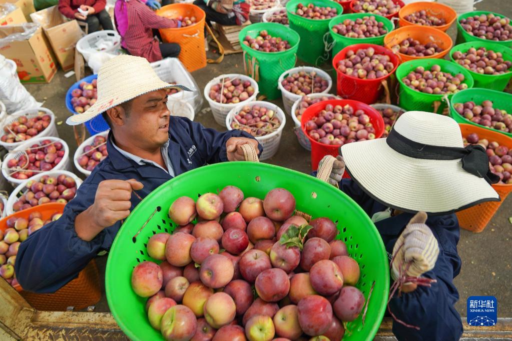 10月20日,在四川甘孜鄉城縣青德鎮萬畝果園內,村民搬運采摘的蘋果。