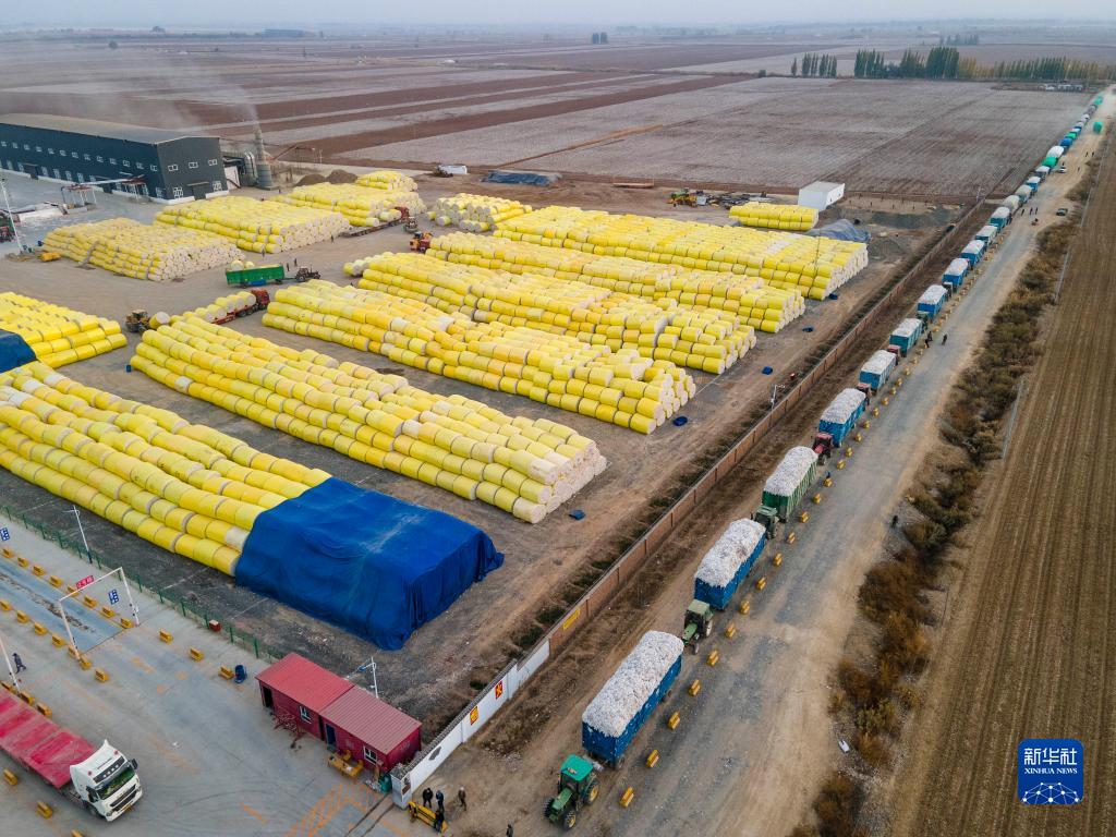 新疆沙灣市的棉農(nóng)在一家棉花收購廠外排隊等候銷售(10月20日攝,無人機(jī)照片)。