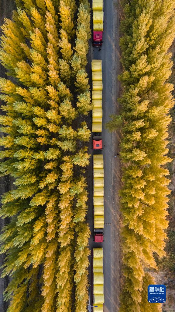 在新疆沙灣市,卡車載著棉花排隊等候進入一家棉花收購廠(10月20日攝,無人機照片)。新華社記者 胡虎虎 攝
