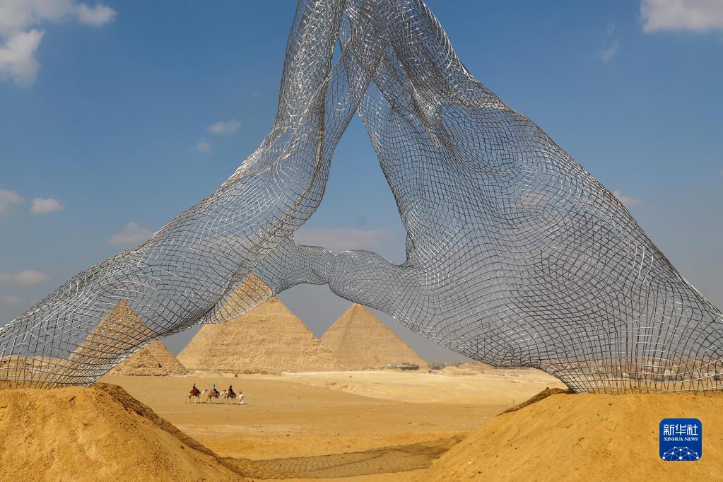 首屆金字塔國際藝術展10月21日在埃及吉薩金字塔景區開幕,來自埃及、美國、俄羅斯等國的十余位藝術家在景區內露天展出了大型雕塑等藝術作品。