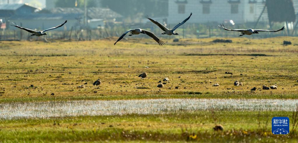 入秋以來,云南省迪慶藏族自治州香格里拉市納帕海國際重要濕地迎來越冬黑頸鶴。首批黑頸鶴抵達以來,已監測到200余只。