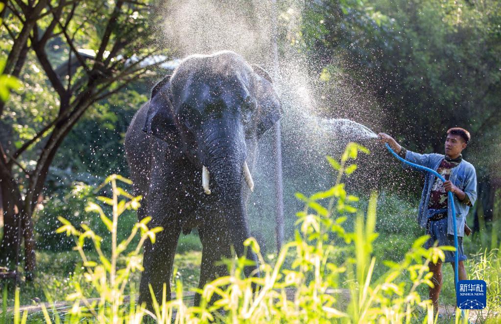 10月27日,工作人員在泰國(guó)南邦府的大象保護(hù)中心給大象洗澡。