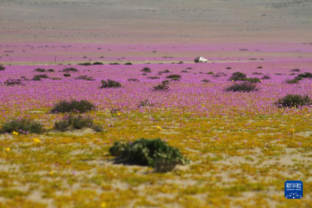 在冬季降水量較多的年份,開春之后,阿塔卡馬沙漠最南部靠近海岸的地方會有很多沙漠植物發芽、開花。由于今年6月至8月阿塔卡馬沙漠南緣經歷了幾場降水,春季到來時,這里便綻放出大片的花毯。“開花的沙漠”這一現象作為智利北部春季偶有出現的美景,吸引了各地的旅游者,也為當地科學家研究耐旱植物特性、利用基因技術發展耐旱作物提供了“天然實驗室”。