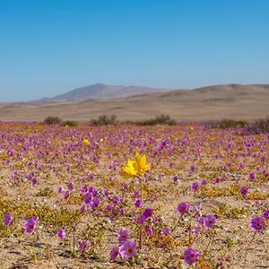 在冬季降水量較多的年份,開春之后,阿塔卡馬沙漠最南部靠近海岸的地方會(huì)有很多沙漠植物發(fā)芽、開花。由于今年6月至8月阿塔卡馬沙漠南緣經(jīng)歷了幾場(chǎng)降水,春季到來時(shí),這里便綻放出大片的花毯。“開花的沙漠”這一現(xiàn)象作為智利北部春季偶有出現(xiàn)的美景,吸引了各地的旅游者,也為當(dāng)?shù)乜茖W(xué)家研究耐旱植物特性、利用基因技術(shù)發(fā)展耐旱作物提供了“天然實(shí)驗(yàn)室”。