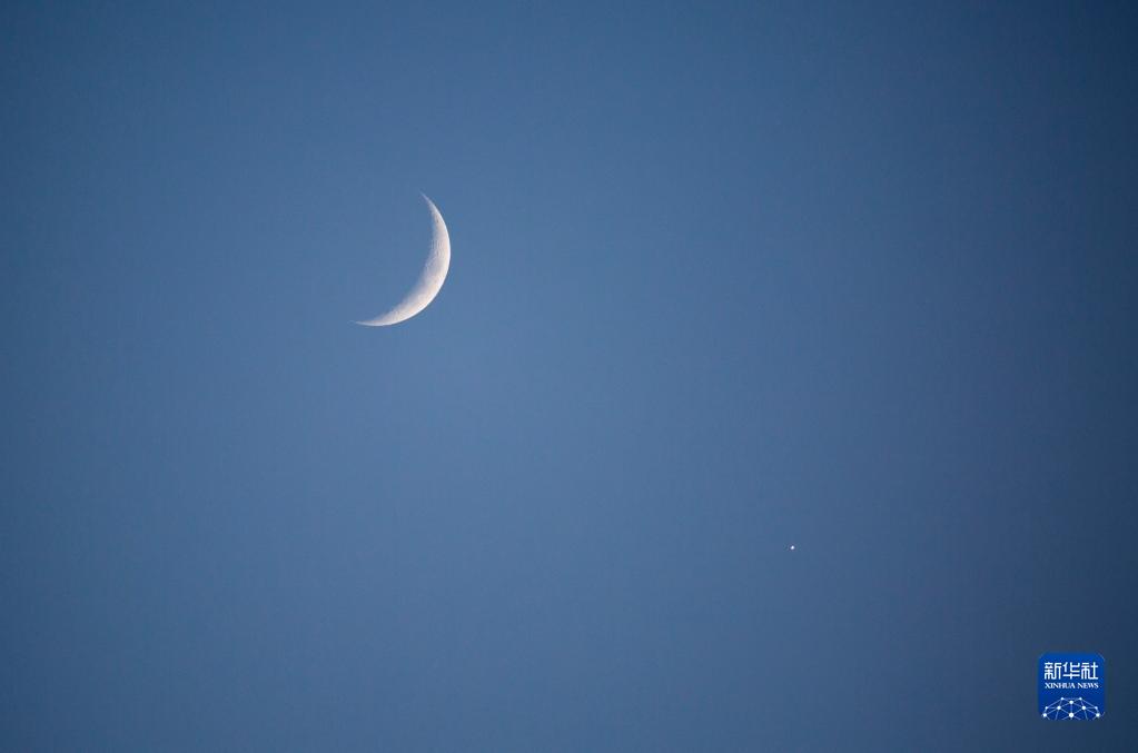 11月8日傍晚在江西省九江市都昌縣拍攝的金星合月景觀,金星和月球在天空相互呼應,格外醒目。
