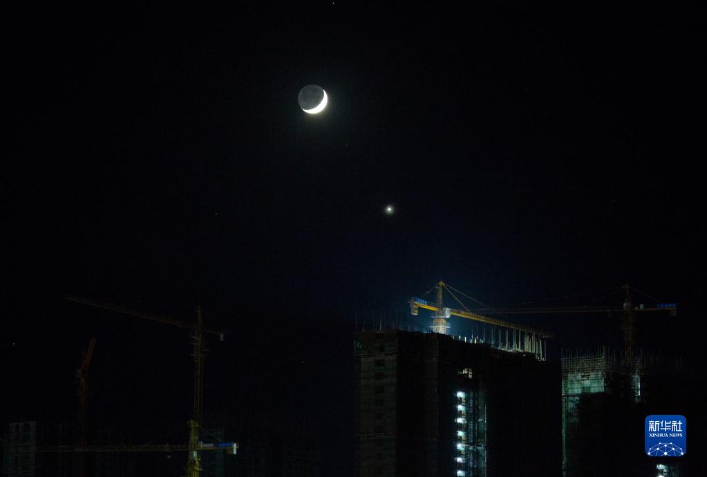 11月8日傍晚在江西省九江市都昌縣拍攝的金星合月景觀,金星和月球在天空相互呼應,格外醒目。