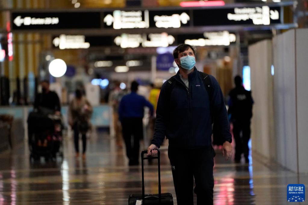 11月8日,在美國(guó)弗吉尼亞州阿靈頓的里根國(guó)家機(jī)場(chǎng),旅客戴著口罩走在航站樓里。
