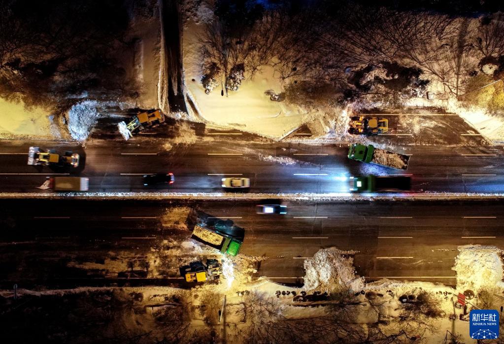 11月11日晚,在通遼市城區,作業車輛連夜清理積雪(無人機照片)。