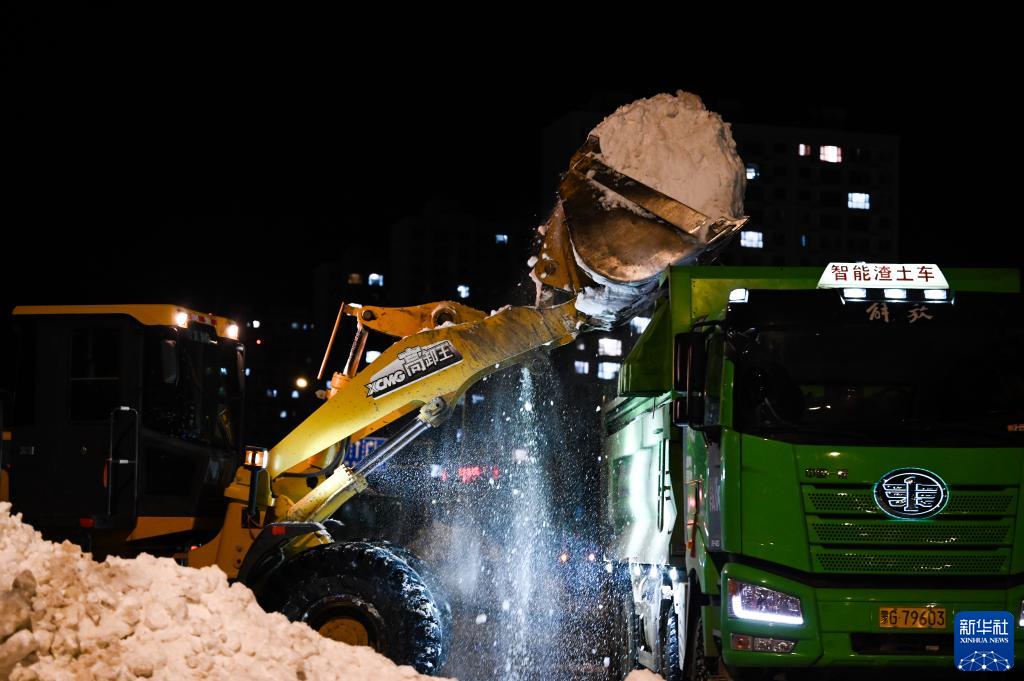 11月11日晚,在通遼市城區,作業車輛連夜清理積雪。
