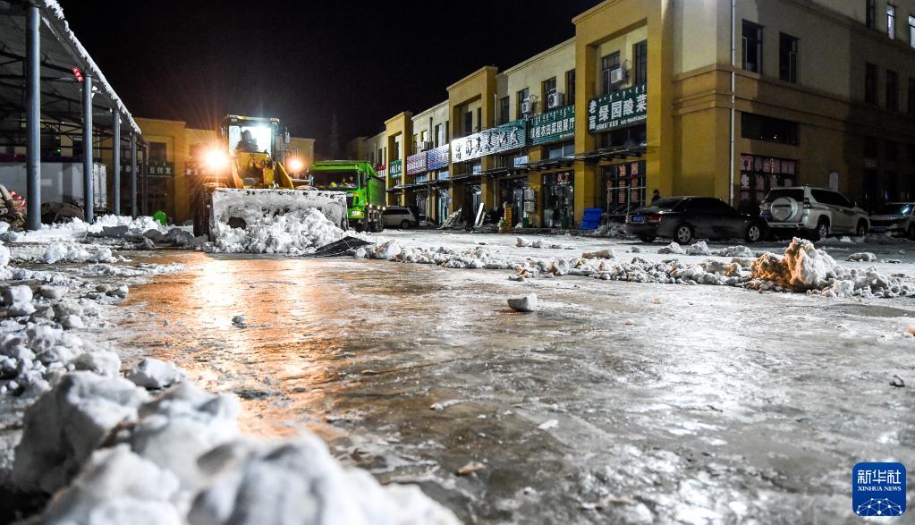 11月11日晚,在通遼市運達綠色農副產品批發市場,作業車輛連夜清理積雪。