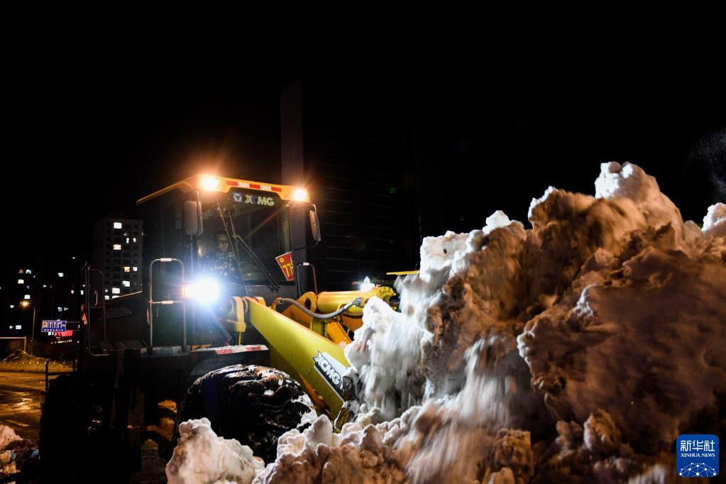 11月11日晚,在通遼市城區,作業車輛連夜清理積雪。