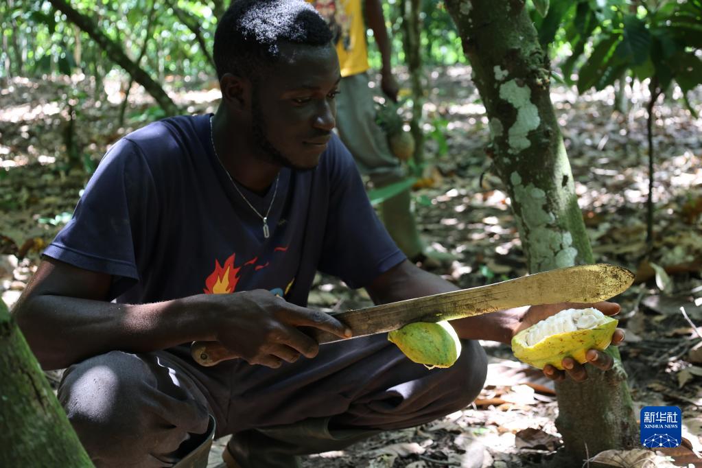 11月15日,在加納東部省的一處可可種植園,一名種植戶在切割可可果實(shí)。