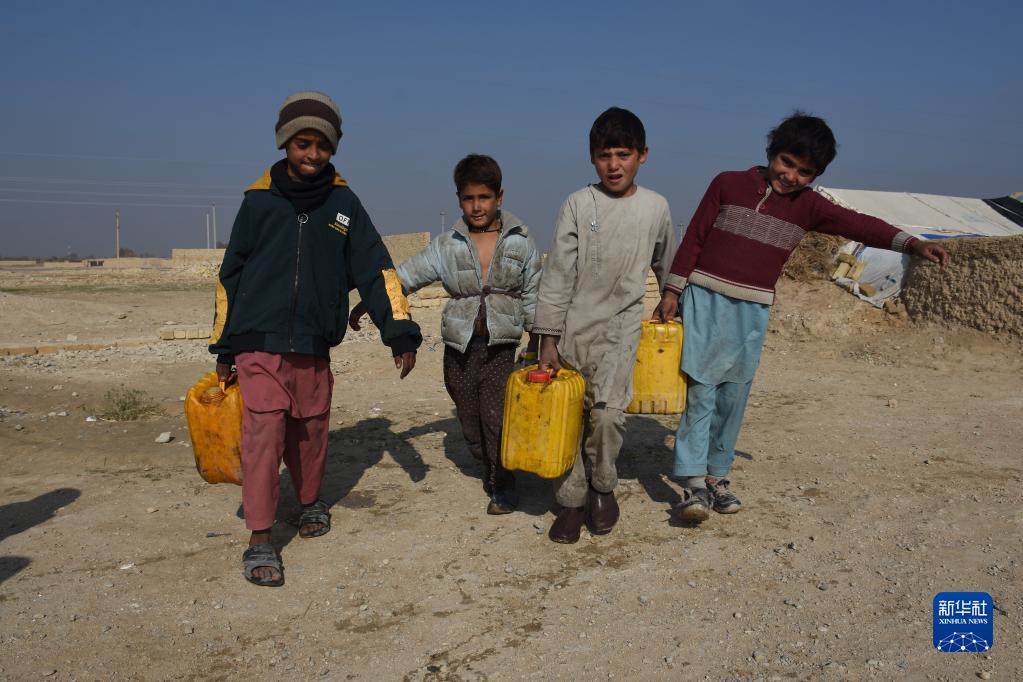 11月20日,在阿富汗馬扎里沙里夫一處流離失所者營地,幾名孩子打水歸來。新華社發(卡瓦·巴沙拉特攝)