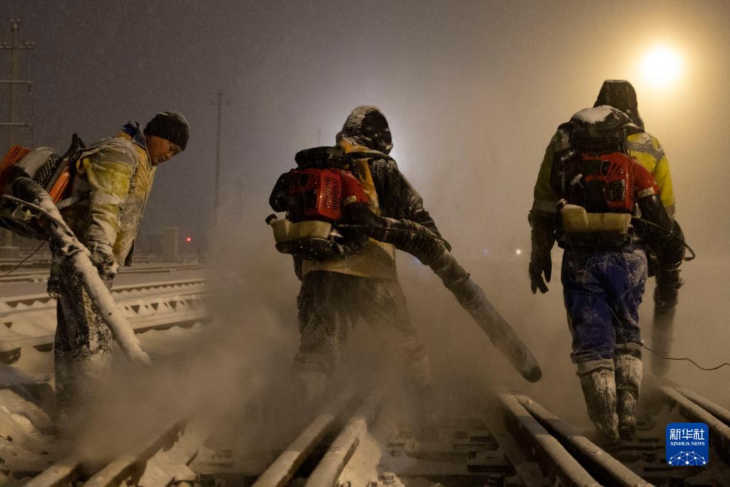 11月22日凌晨,在雞西站西場,工作人員進行清雪作業。