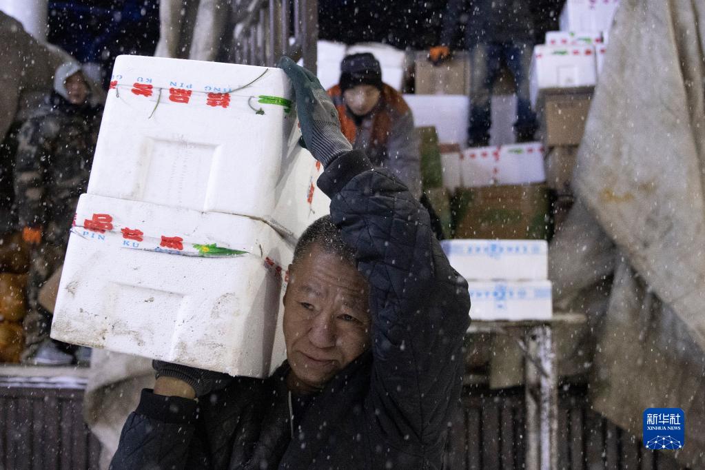 11月22日凌晨,在雞西市一家大型蔬菜批發市場,工人們在搬運蔬菜。